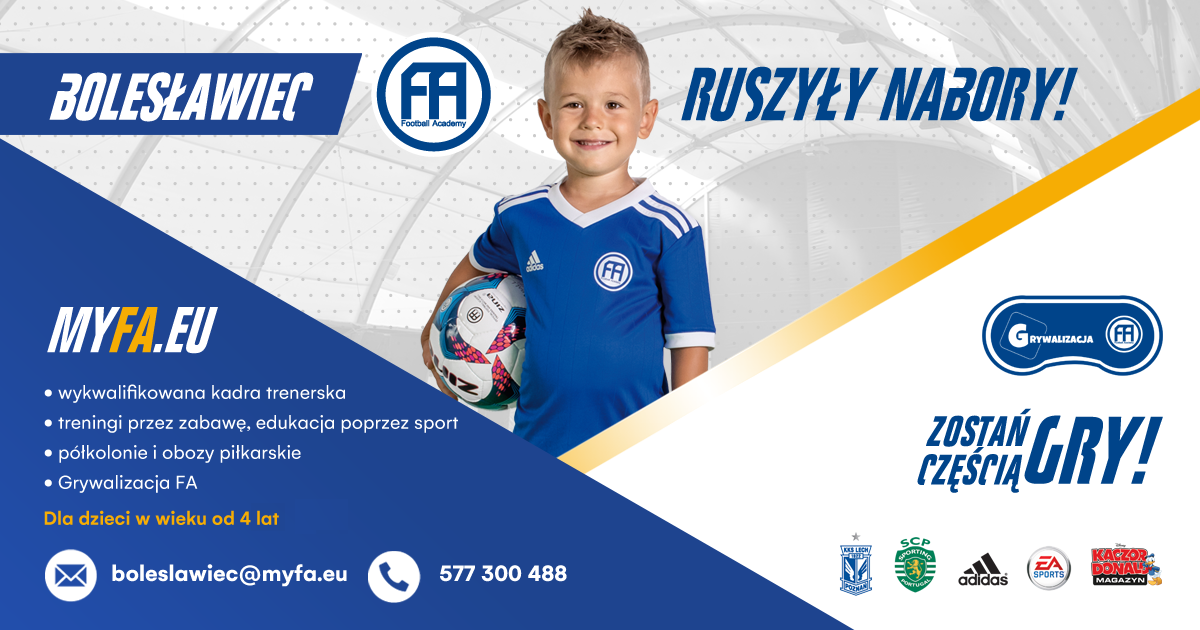 Rodziców dzieci, które jeszcze nie dołączyły do największej szkółki piłkarskiej w Bolesławcu zapraszamy do zgłoszeń swoich pociech i zapisania dziecka na dwa próbne treningi w Football Academy Bolesławiec: